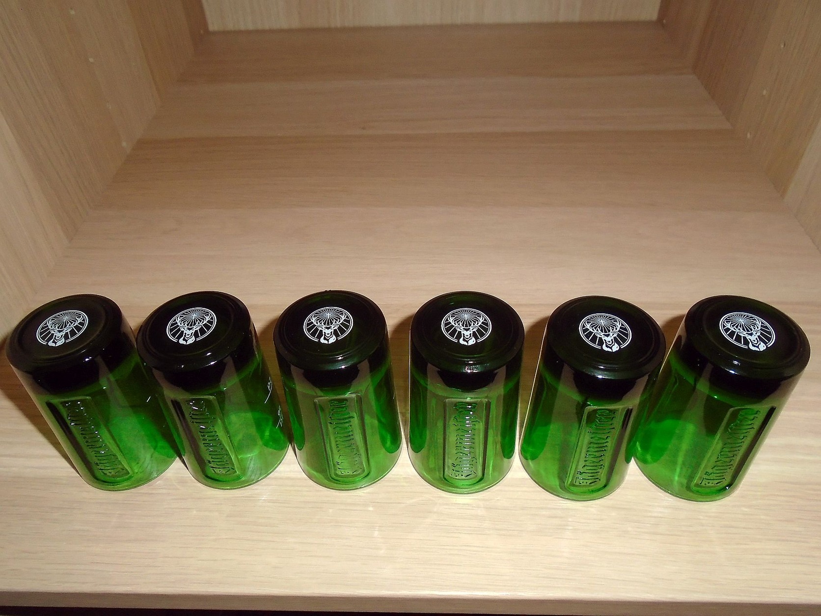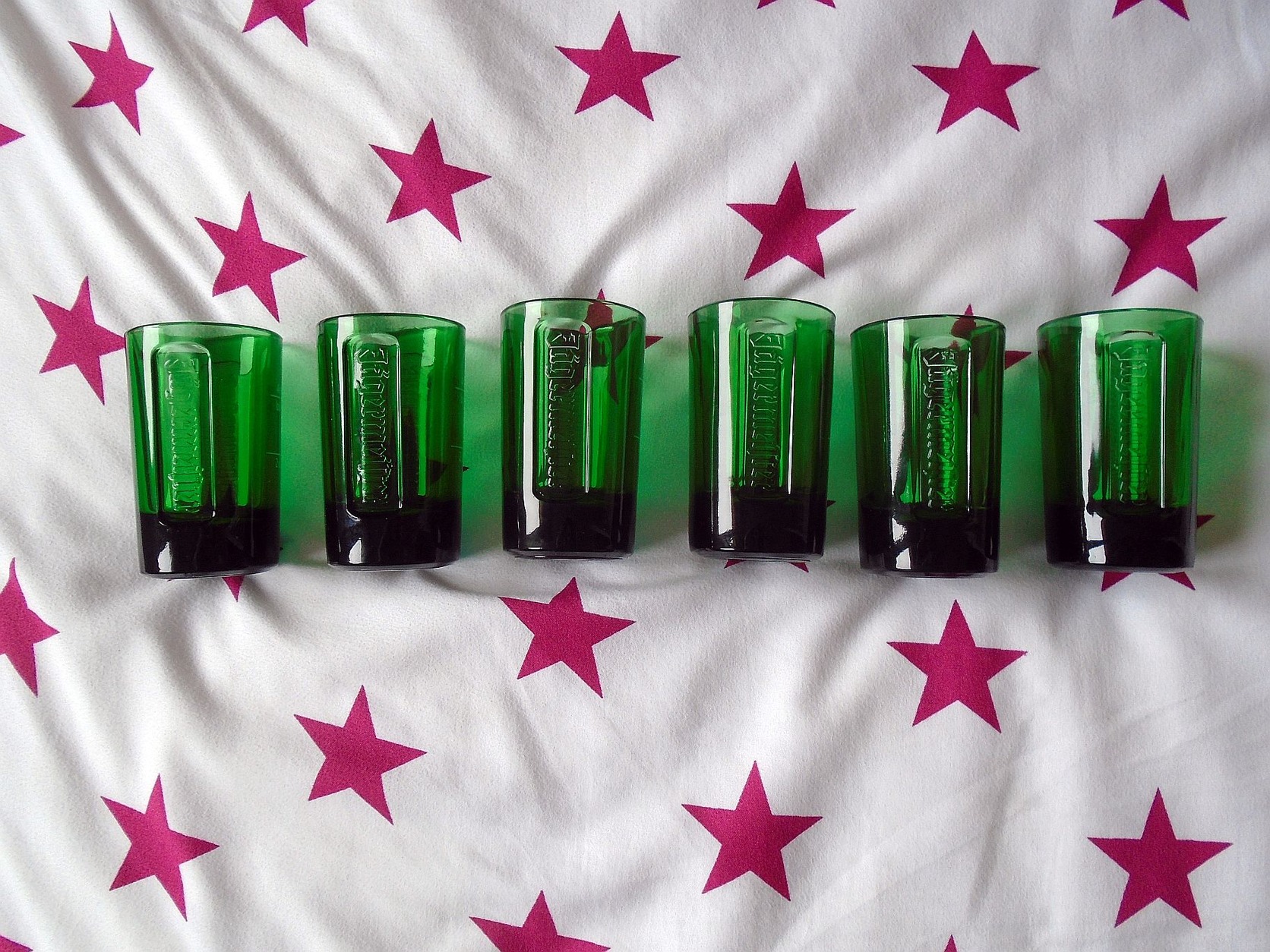 Egyben eladó 6db új, zöld színű 5cl-es Jagermeister kupicás pohár.