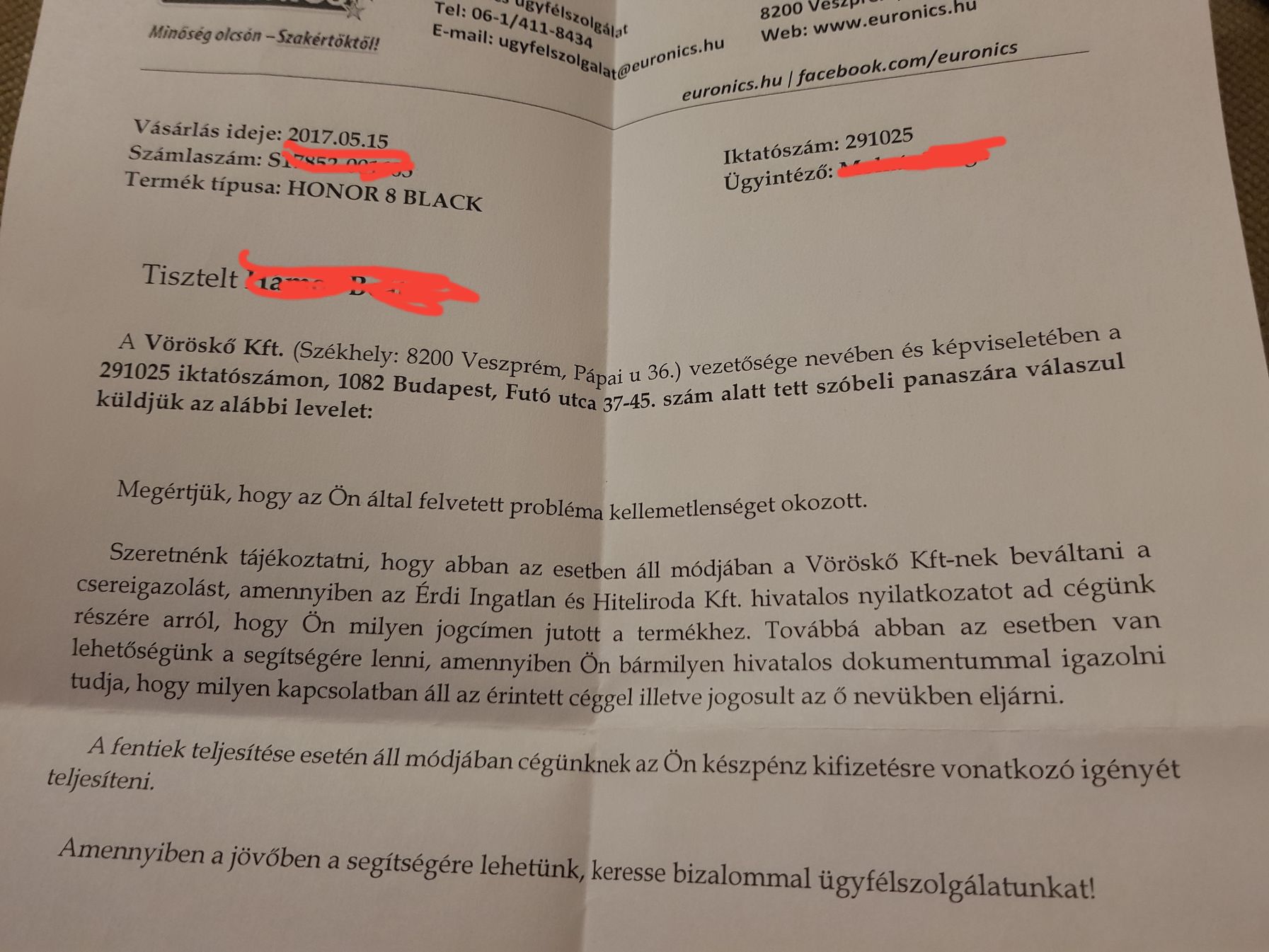 Nagyon függ attól milyen levelet kaptál, miről, mikor (amit ugye az elején egyáltalán nem is említettél, de most is kissé homályos). Meg mondjuk, hogy 500k-s tévé volt fent 10 forintért, vagy csak 140k helyett 120k lett volna valami. Szerintem az békéltetőnél is nagyon nem mindegy.