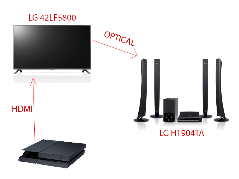 Átolvastam az összefoglalót, de nem találtam a problémámra ott megoldást. Abban kérném a segítségeteket, hogy miképp tudnám megoldani az 5.1 hangzást? Adott egy PS4, TV (LG 42LF5800) és egy házimozi (LG HT904TA) az alábbi bekötéssel: