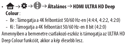 A Beállítások -> Hang és képernyő -> Videokimeneti beállítások -> Videokimeneti beállítások alatt látod, hogy mit állított be, a 3840 x 2160 - 60 Hz és RGB a max amit tud, illetve HDR mellett YUV422-re áll át. Egyedül amit érdemes lehet állítani az az RGB-tartomány, a tévével összhangban teljesre javallott átbillenteni.