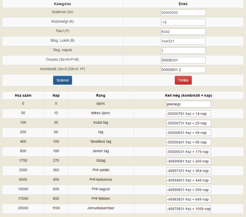 Ugyanis a következő ranghoz tartozó napok számát hamarabb eléred, mint a hsz számot, olyan nincs, hogy valaki 1 nap alatt 50000000 hsz-t írjon, de még az is ritka, hogy az első 15 nap alatt 50 kombinált érték összejöjjön, ha igen, annak nincs szüksége a kalkulátorra