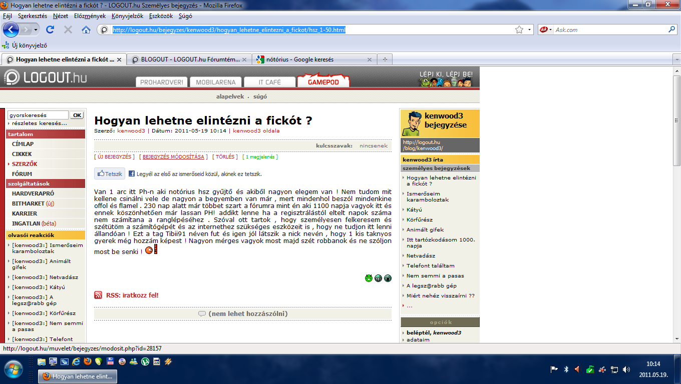 Ezért nincs logout blogom se, mert nem tartom magam sem írónak, sem költőnek, sem újságírónak, hogy cikkeket írjak, egész egyszerűen meghagyom a szemetelést azoknak, akik azt hiszik magukról, hogy képesek ilyesmire.