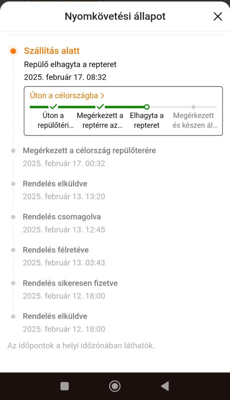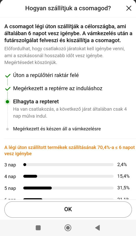 A következő lépés a "Vámhatóság által kiadva lesz", ez még nem pipa. De ahogy elnézem, jó nagy csúszással frissítik ezeket, mert ma reggel még semmi nem volt, közben meg már tegnap délután csekkolták a cuccot.